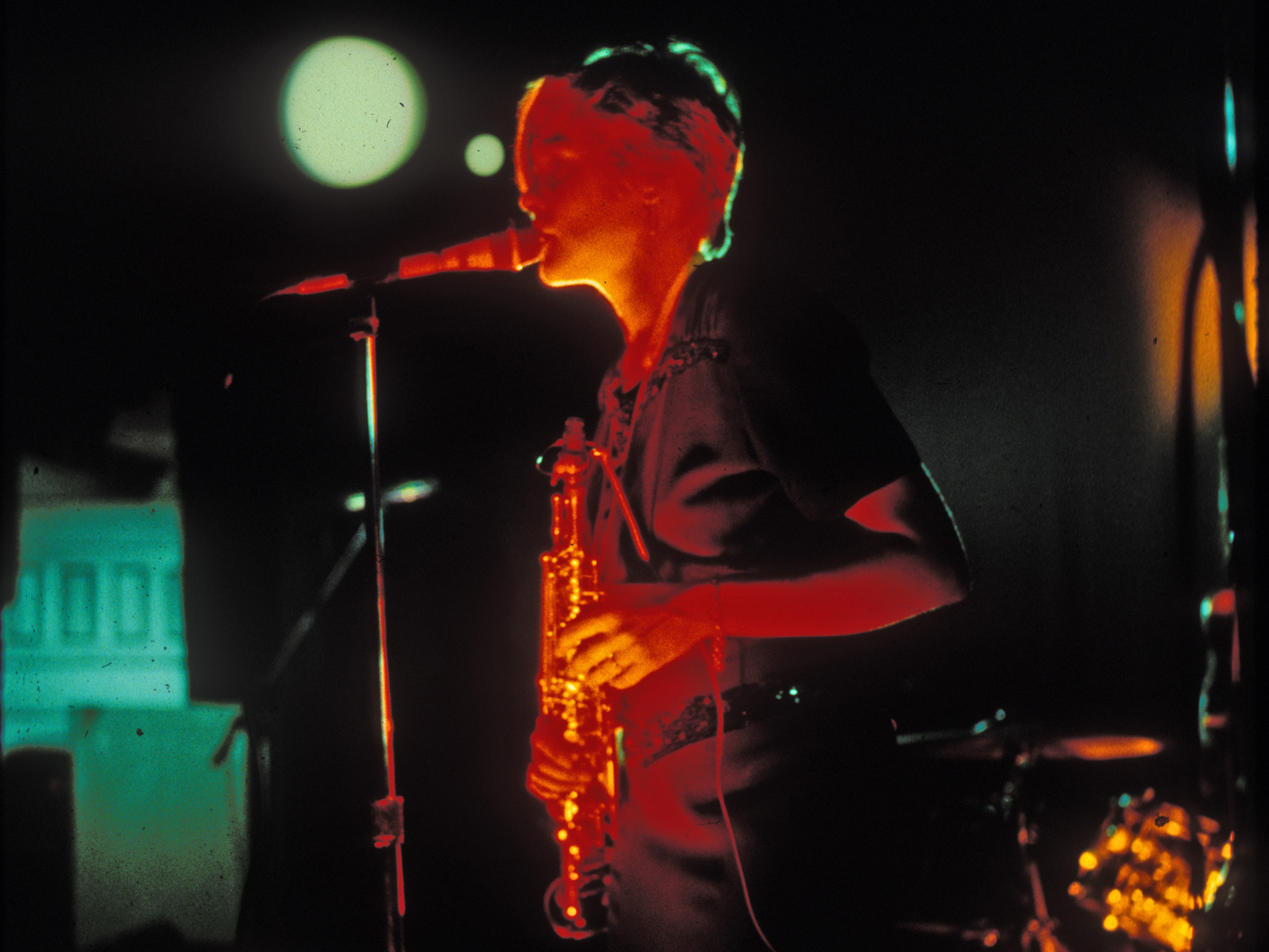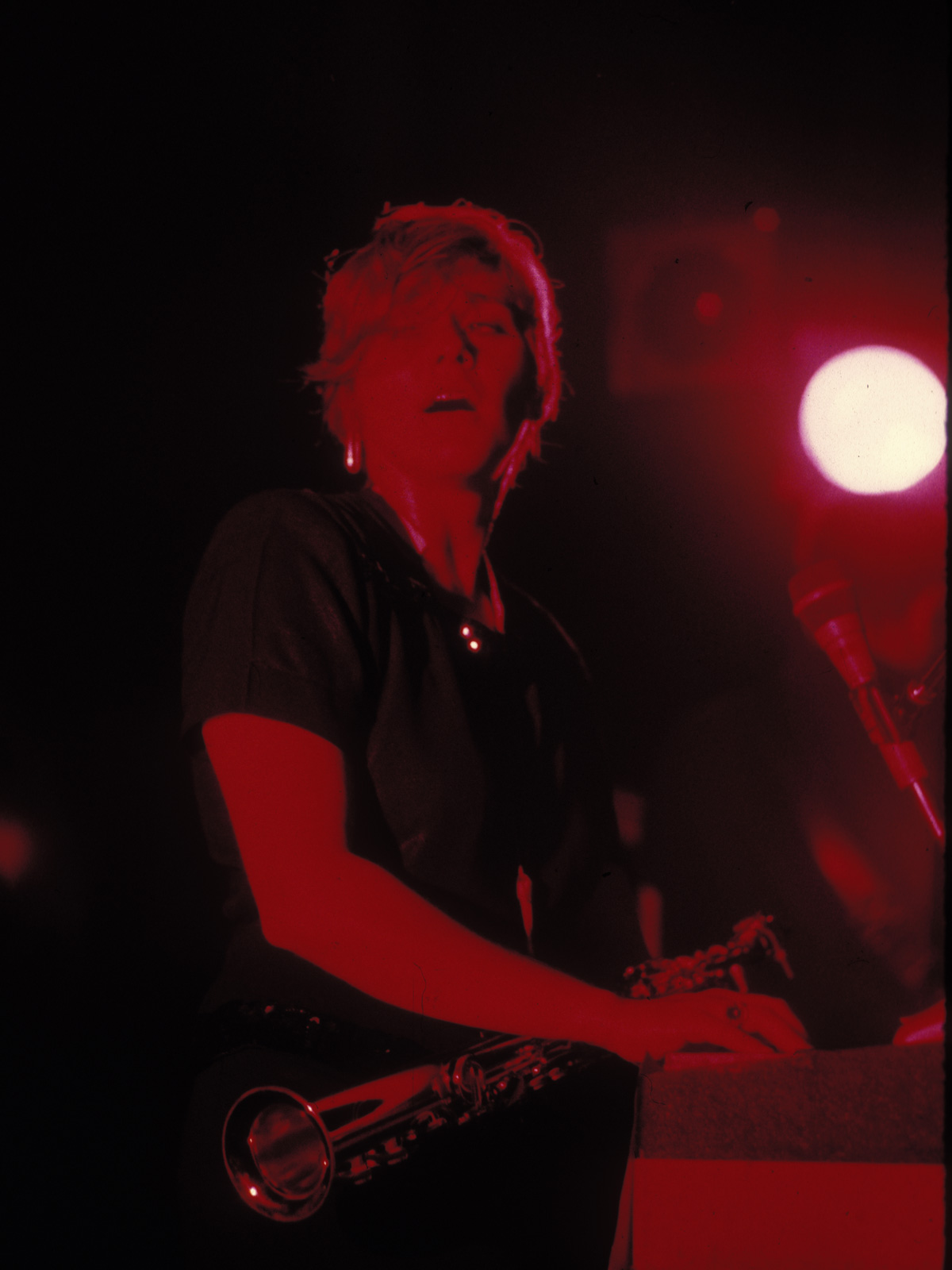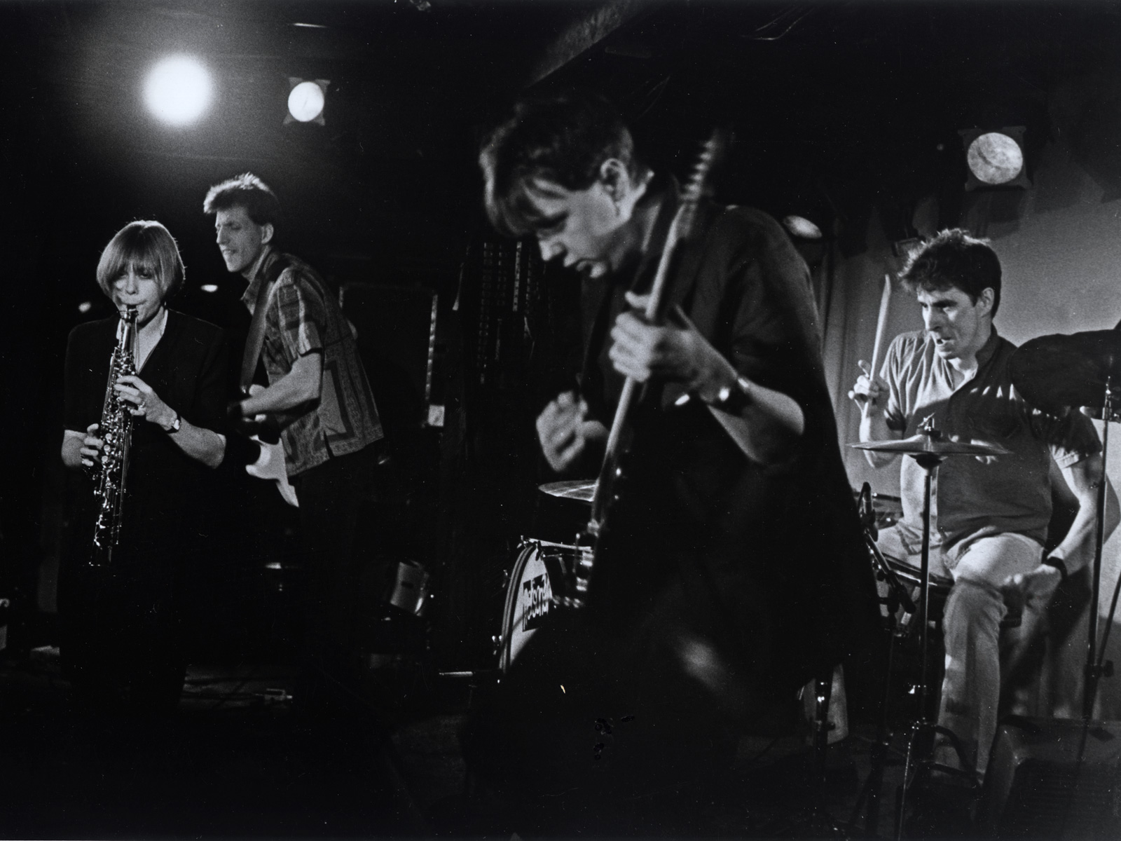 Personal Effects performing live at Scorgie’s. Photo by by Chris Maggio. Bob Martin – guitar, Paul Dodd – drums, Peggi Fournier – sax, and Robin Goldblatt Mills – bass guitar.