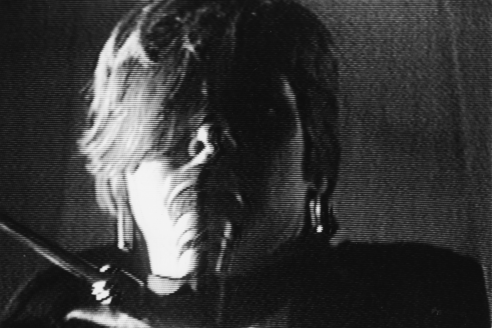 Peggi Fournier of Personal Effects performing performing at “This Is It” show at Community Playhouse in Rochester, New York in 1984. Video still by Duane Sherwood.