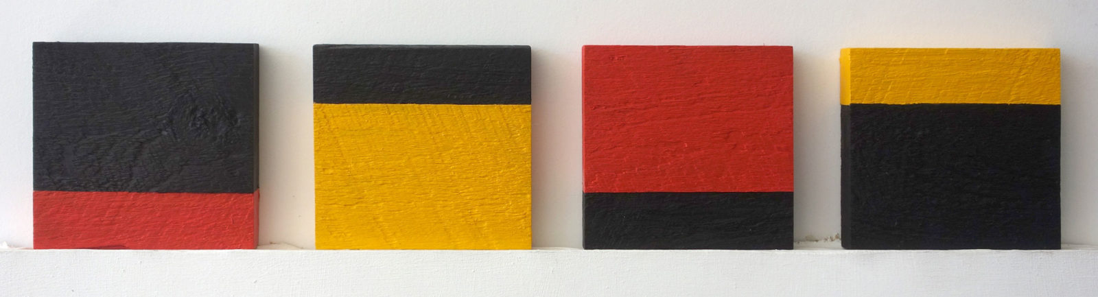 They are awkward to hang. I ask that be hung in a specific order and hope they don’t wind up being separated when the show is hung. The first year I painted the two boards a different color, three colors for the four pieces, all straight from the tube. The second year I toyed with leaving the wood unpainted altogether as the the two pieces were different tones but I chickened out. I let the natural wood show and only used two colors.