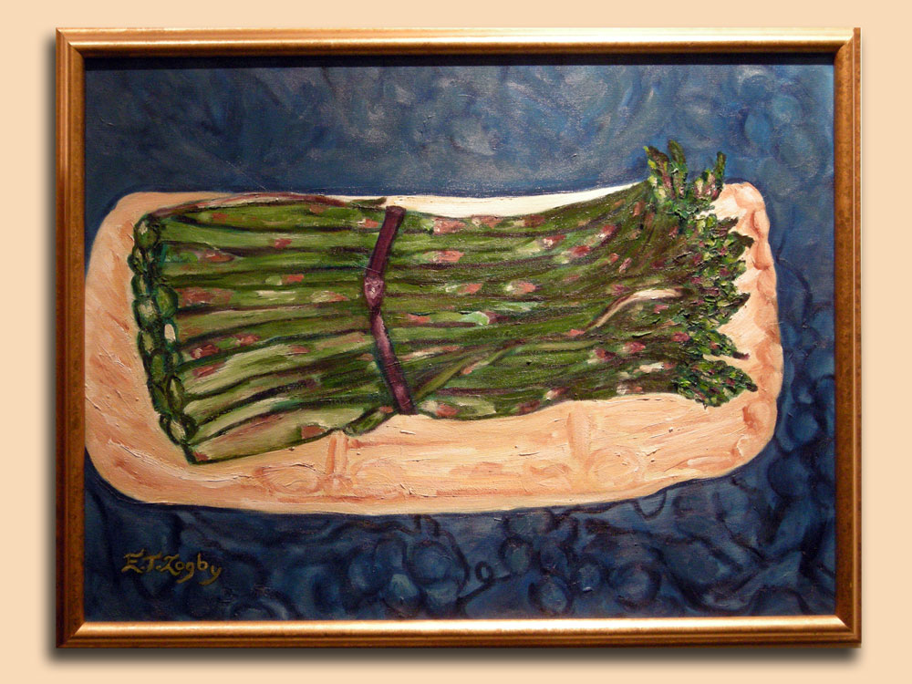 We previewed the dinner menu on the flyer by the tv and I set my sites on the “Chicken Parm”. We headed down the halls to the dining room and walked slowly by the residents art that hangs outside the dining room. Peggi’s mom sked what I thought of this painting of asparagus by E. T. Zogby and I said, “I love it”. Peggi’s mom laughed and said , “I figured you would like this”.
