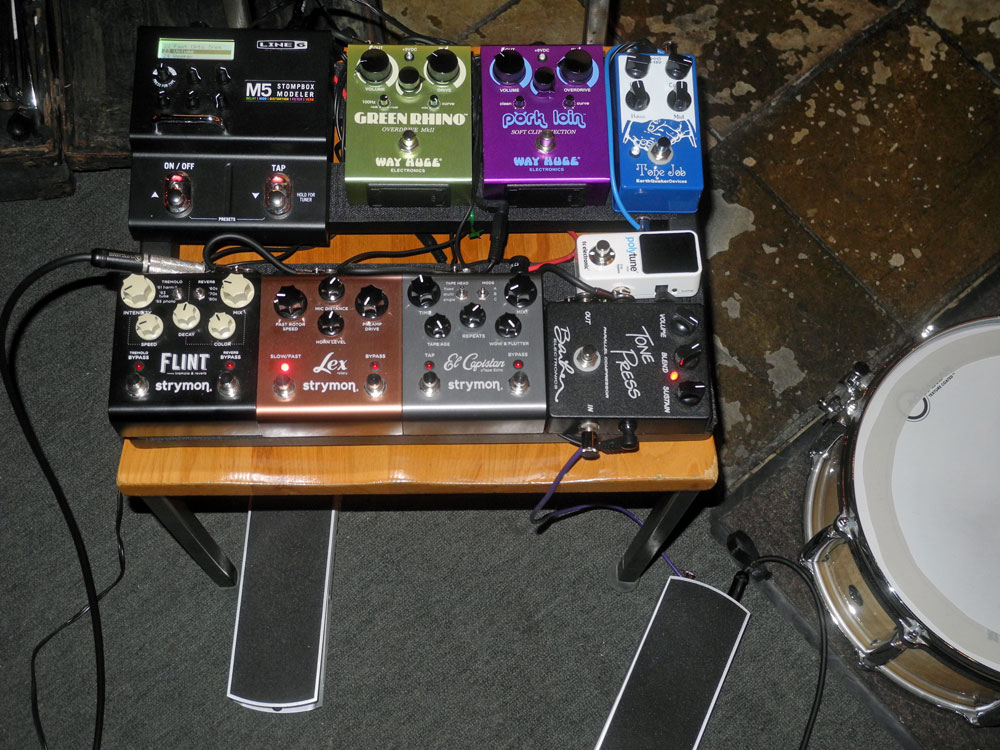 I took this shot last week as we were setting up for our Margaret Explosion gig and looked up some of the gear when I got home. I’m guessing most of the magic comes from the M5 Stompbox Modeler but I found the rotating speaker system effect from Strymon pretty intriguing. Bob’s playing has been amazing lately but he’s going to miss tonight’s gig. He’s on the disabled list with a pinched nerve. Jack Schaefer will be joining us on bass clarinet and guitar.