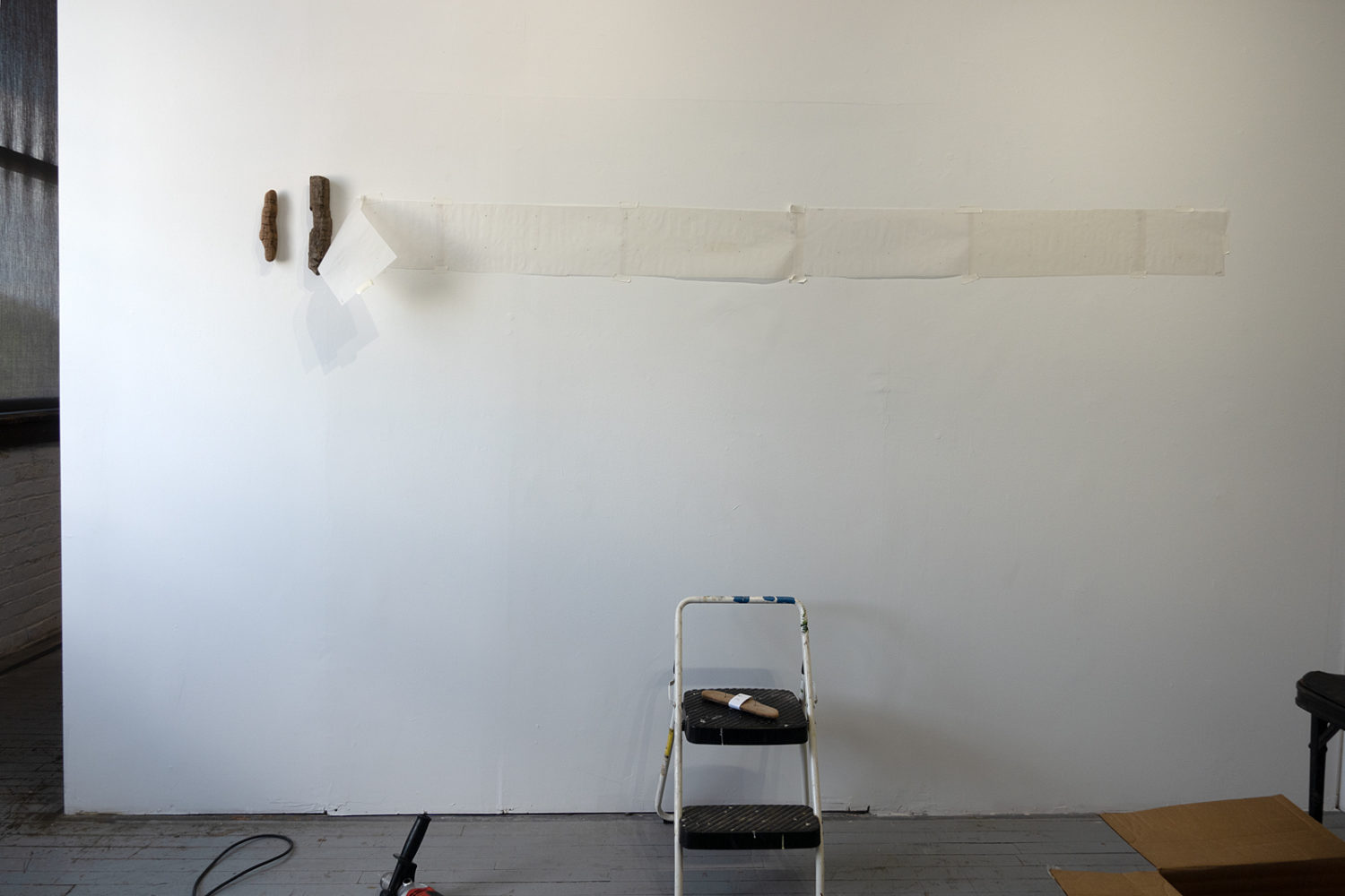 Peggi and I decided to hang “Los Inmigrantes” first. I’ve had them hanging in my studio for about a year now. I drilled a couple of small holes in the back of each, corresponding holes in the wall and then backed a finishing nail into the holes in the wood pieces. This allowed me to push the piece toward the wall but not but not flat against it. I did this rather organically and started to take measurements of all the holes so I could transfer the piece downtown. Peggi suggested that I take a tracing of the holes, a brilliant idea that she said sprung from her sewing background. We laid the tracing paper out on the freshly painted wall and I drilled right though the paper.