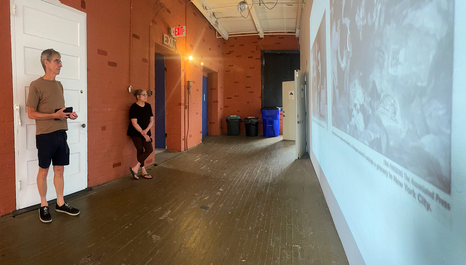 Duane lives in Brooklyn but came up for a wedding. He missed the opening so Peggi and I gave him a private showing yesterday afternoon. Colleen was working, adjusting a cloud of steel wool, so the studio was open. We turned on the lights in the gallery and then set up the slideshow while Duane took in the show. It is a little more difficult to get the hallway dark in the middle of the day and I can see in this photo I forgot to temporarily twist that light bulb off but Duane got the picture.
