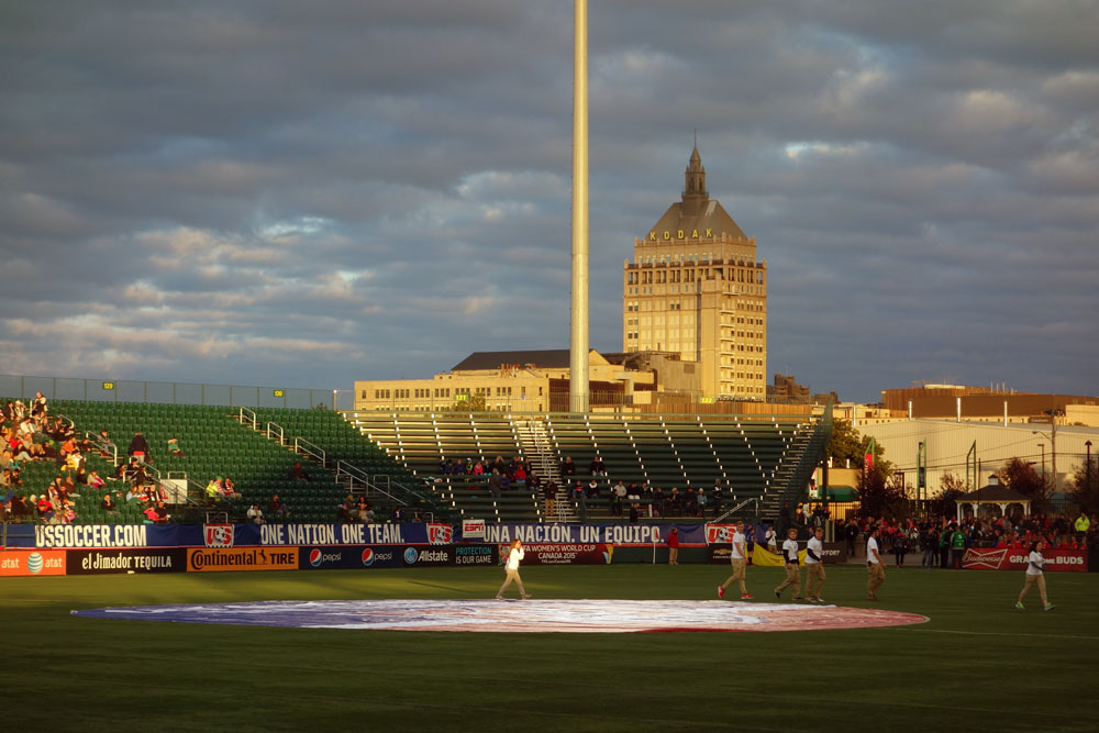 The Fringe Fest started here last night but we were over at the soccer stadium where the US Women’s team met Mexico in their last pre World Cup qualifying game. We got there early to watch the warmups up close. There was a large contingent of “Followers,” people who follow the US team from international city to city with drums and banners and chants. Their theme song, which they belted out throughout the game was Little Peggy March’s “I Will Follow Him.” I hope she’s collecting some royalties for this gem.