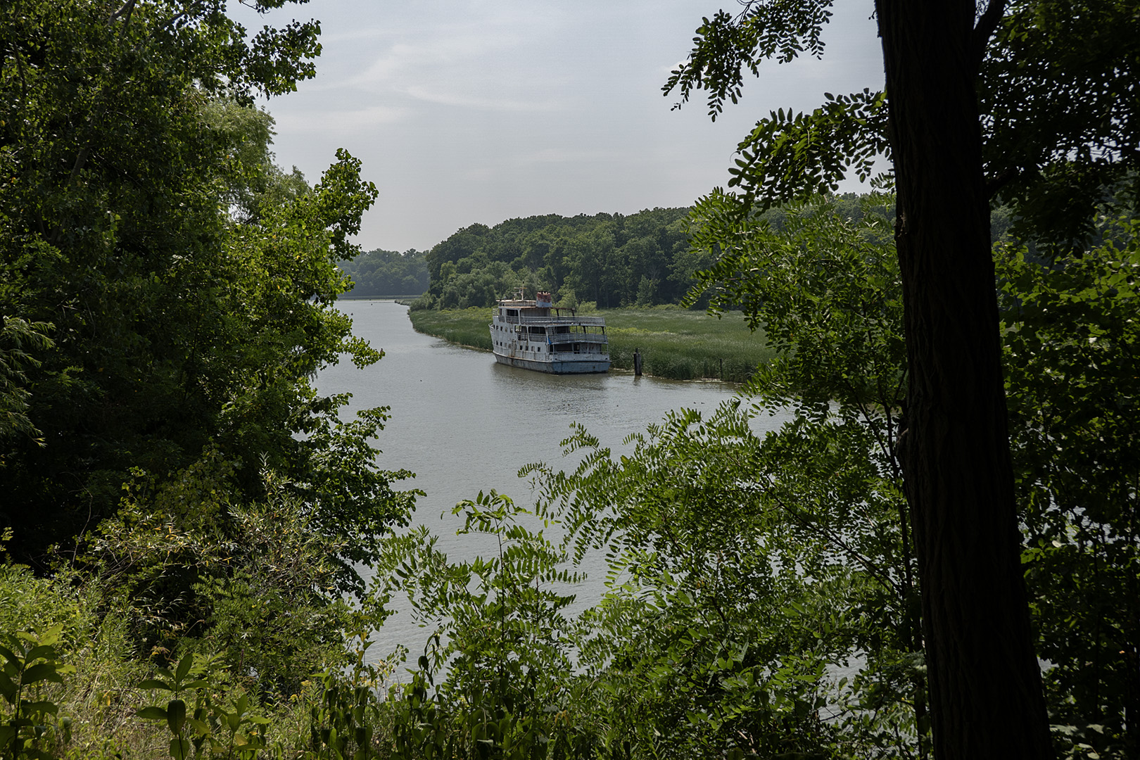 The swing bridge is open at the mouth of the bay so we were there in minutes. The current owner is the son of the original owner and the mid-century modern home has thankfully not been altered, only improved. Cynthia pointed out the clearstory windows that run along the top of the house, a new architectural term for us. Some of the interesting features include a soundproofed telephone booth. A light goes on when you sit down and there is a hardwired intercom to the house next door for setting up carpools when both families included Kodak employees. The entire model home darkroom displayed in the Kodak exhibit building at the 1939-1940 World’s Fair in Flushing is installed in the basement. And a feature that you might have to be an electrician to appreciate. Each of the six single-bulb lights in the hallway were modified to accommodate two light bulbs wired in series, not parallel. So all but two or three of the twelve original bulbs, now 73 years old, are still in service.