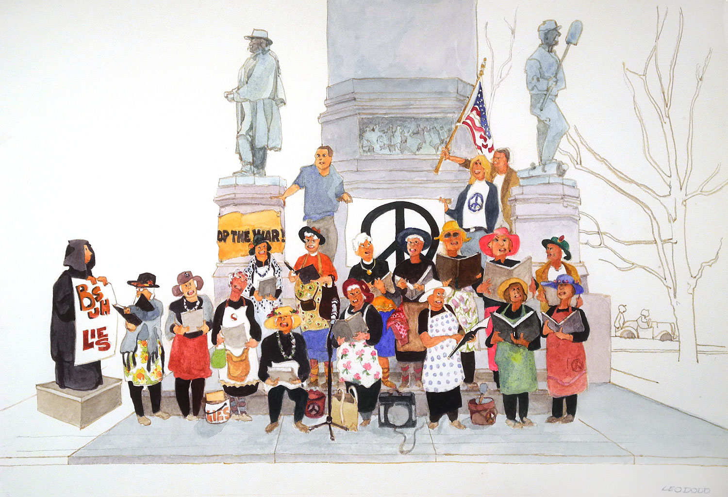 Leo Dodd watercolor Rochester Peace Demonstration at Washington Square Park
