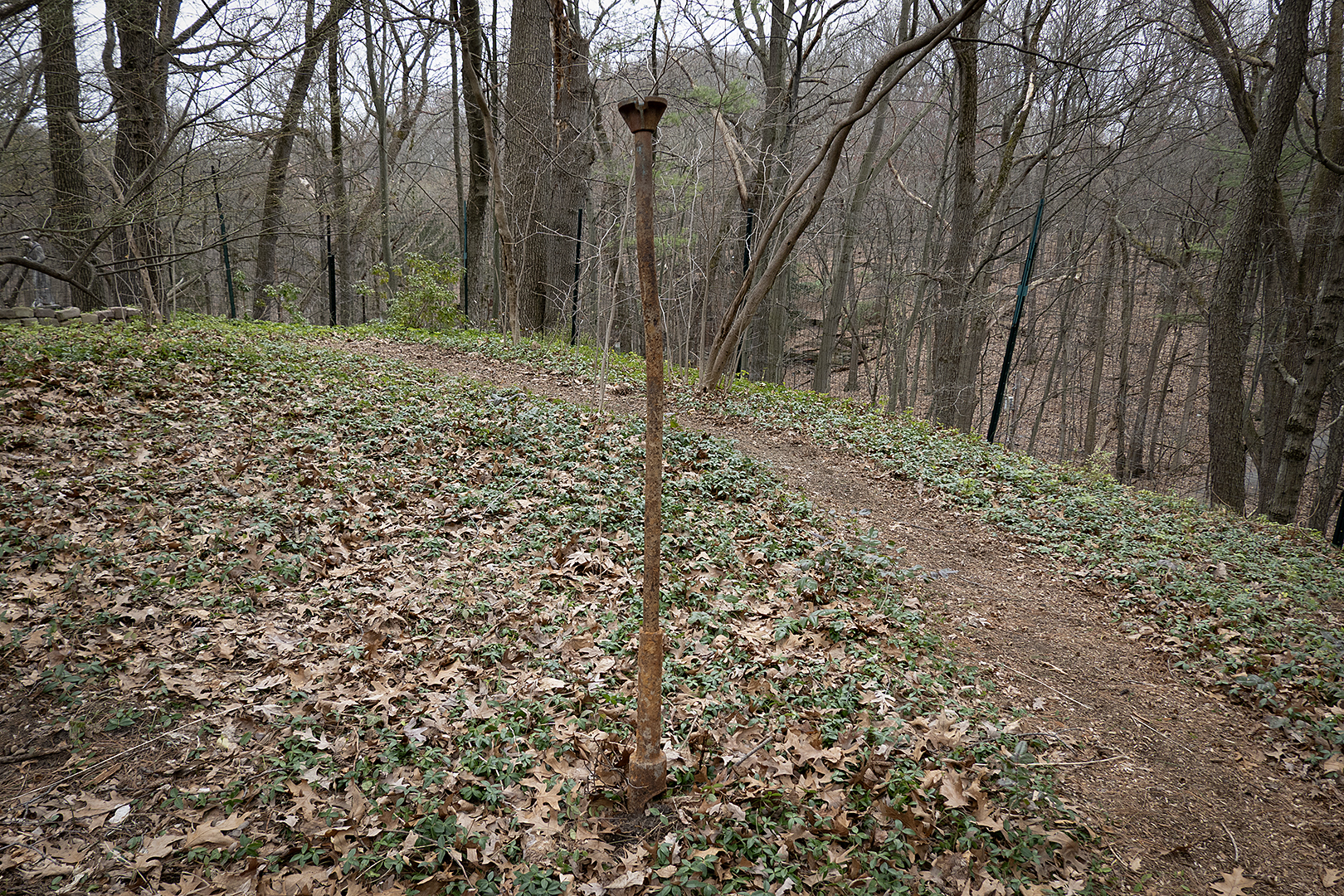 We walked by this pipe yesterday on our way to the park. It was in front of a house where the yard had been recently dug up for some sort of infrastructure problem. We were out in the park when I suggested we turn around and take this thing home with us. I had my iPad with me and we were listening to CalZone’s latest “Record Geek” show. Peggi took the iPad and held it in a way we could both listen while put this elegant fixture over my shoulder. I drove stake into the ground in our backyard planted the readymade on top.