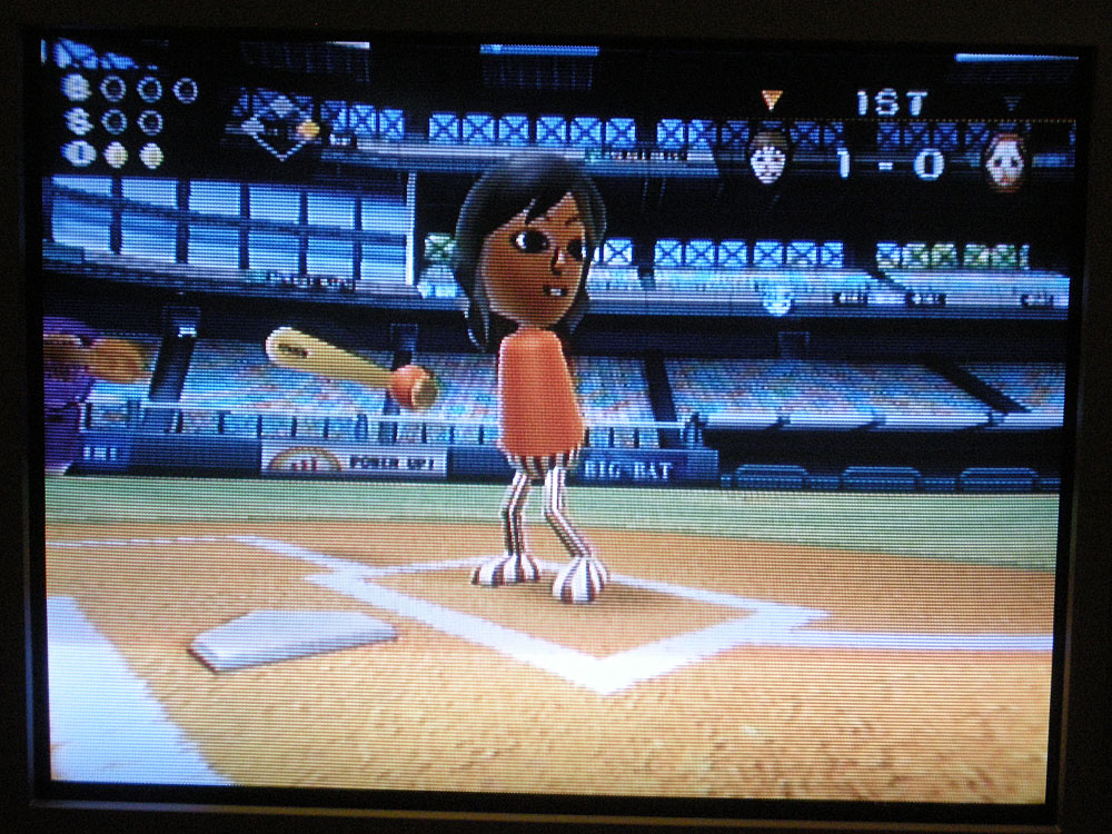 The last of the family holiday gatherings was at my sister’s for pizza. I spent some time in the basement with our nieces and nephews and their pet rabbit. I tried my hand at Nintendo’s Wii Baseball and managed to foul one off but I struck out pretty quickly. The ball players are all missing limbs for some reason. The hitters have no arms and the fielders don’t have any legs. I’m guessing this player is a woman. I love her pants.