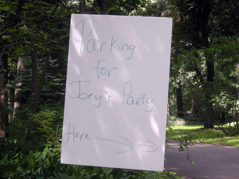 Our neighbors, Rick and Monica, came home from their vacation last night and Monica was wearing a Woodstock t-shirt that she bought at Target. She said some skateboarders that she was starring at flashed the peace sign at them. They missed Joey’s party. One of our other neighbors asked if they could use our driveway on Saturday because they were having a big party. We said sure but no one parked in our driveway. It might have had something to do with the arrow on the sign that Joey’s mother made. It was pointing away from our driveway.
