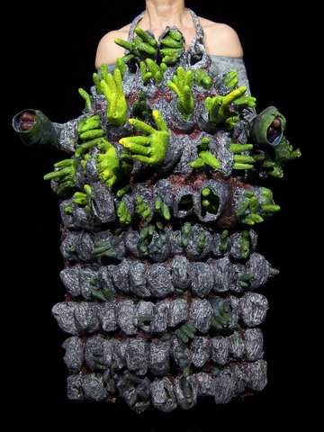 Illa Loeb, a former student of Fred Lipp, creates luscious, painterly, three dimensional art. Her work has an intensely physical hands on feel. You want to touch her work and she does exactly that. She photographs herself wearing her pieces like clothing or aprons. She created “An Alphabet” of with charcoal and vaseline on her mouth and transferred the look of the letters on her lips to paper. Photos of this process are on view on a monitor but you have to ask the student attendee to turn it on.