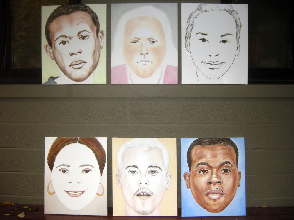 I met a group of kids at a Rochester shelter for the homeless and photographed them while we shared pizza. I did a series of paintings of the kids and was asked to display them at a charity auction last night at Monroe Golf Club. The paintings were still wet when I photographed them on our back porch yesterday. They were arranged on easels at the entrance to the party room last night and looked completely out of place in the country club setting.