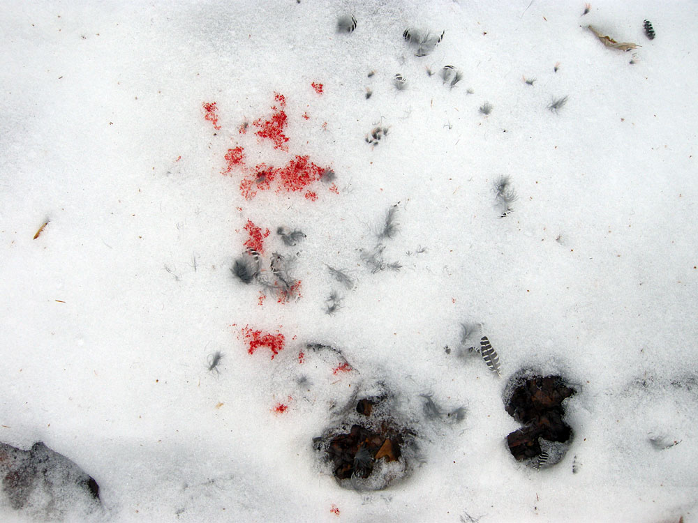 You can the smell the woods again because the ground has thawed. Deer, turkey and coyote tracks run in all directions. Hawks and giant woodpeckers work the airspace. Snow topped fallen trees make the valleys look like Franz Kline paintings. Life and death issues are played out on this stage even in the depths of winter. We came across this scene this morning where the blood had crystalized on the snow.