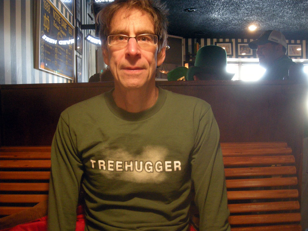We each wore the only green clothes we have but they don’t come close to the toxic green that most revelers wear. The place was packed at noon. We could hardly hear each other. The music was all thump, thump and then a guy with a guitar started playing goofy folk ditties. After his first song he announced, “Drink up and I’ll sound better”. One of them was stuck in our heads for the way home but I can’t remember it now, thank god. An infomercial was playing on a tv above our booth, featuring Christie Brinkley and Chuck Norris on outdoor exercise equipment. I was mesmerized by the surrealness of it all.