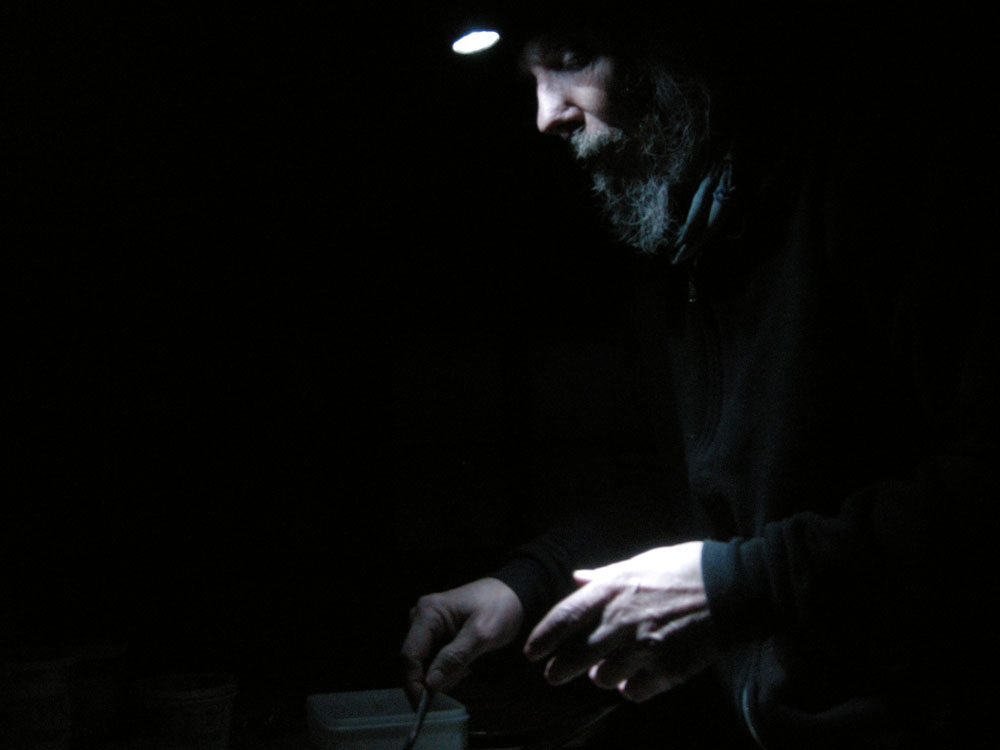 Pete and Shelley live in a dead zone and they like it that way. There are no cell towers near by and the mountains block the distant ones. There’s no electricity or running water either so well meaning family members give them battery operated toys. Last time we were up there I took this photo of Pete preparing food with a head lamp. And we came home with some coasters that Shelley’s sister gave them.