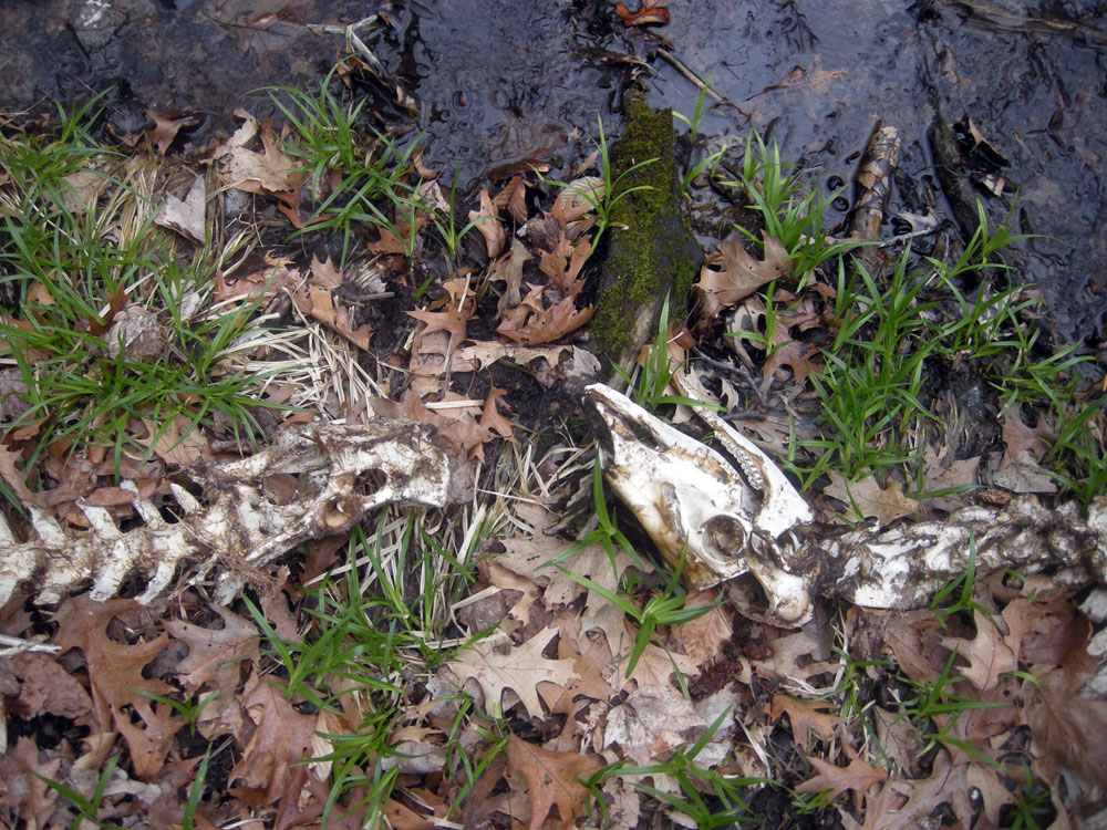 We found the bones shown above on the left on one side of the creek and the ones on the right on the other. What looked like the head of a strange animal turned out to be the back end of a deer. When we flipped them both 180 the entire rib cage fell into place. You can see the saw marks in the skull from where a rackaholic cut off the deer’s rack.