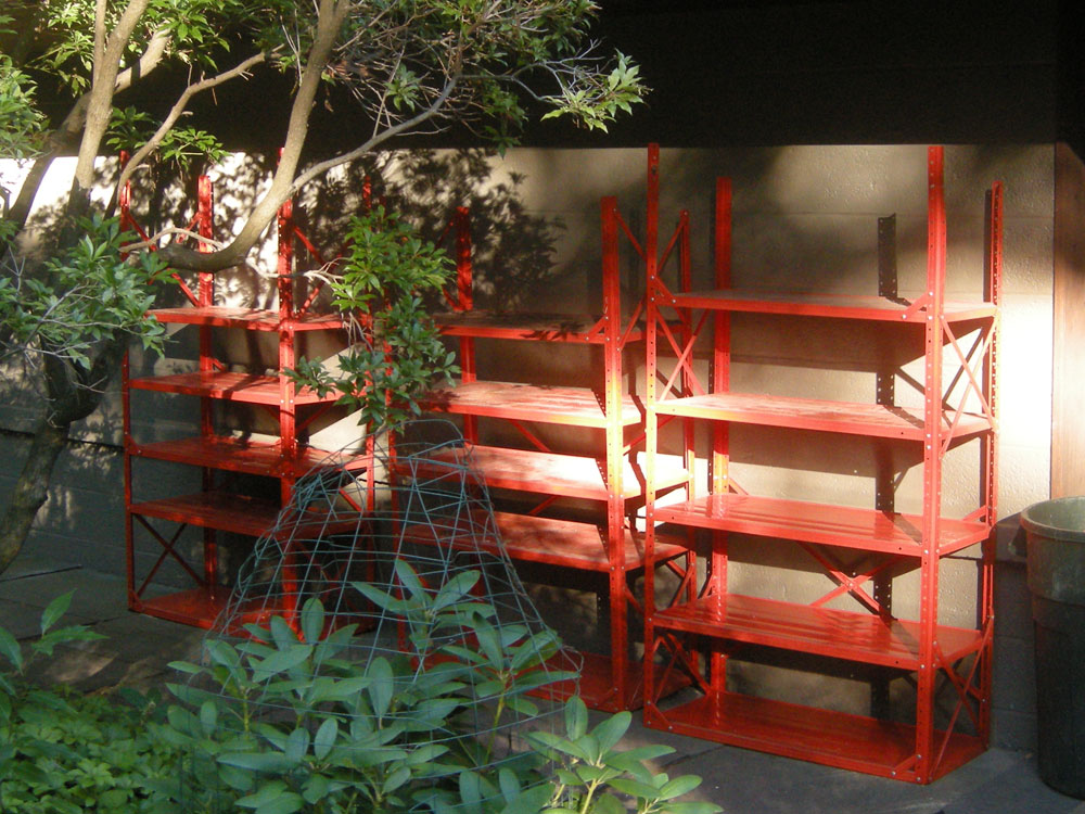 I emptied the shelves and brought them out into the yard so I could even up the lines. I reworked the shelving and supports so they line up with one another. I know this is a bit obsessive but they looked like they had been put together by a madman. I can deal with the bright orange but I at least had to straighten out the site lines before I rehang them.