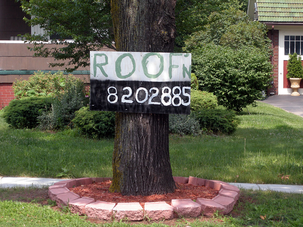I know I like photographing signs and there is no money in that. I found this one this morning on Culver Road near Clifford. It’s perfect! A big piece of plywood nailed to a tree. Roof’n looks just like it sounds. You want to say it. All caps with a subscript “n” then the masterstroke, black reverse field for the phone number. They intended to center the number but ran out of room and that is so much fun to see in a sign. I don’t think I would ever hire them to roof my house but I love their design sensibility.