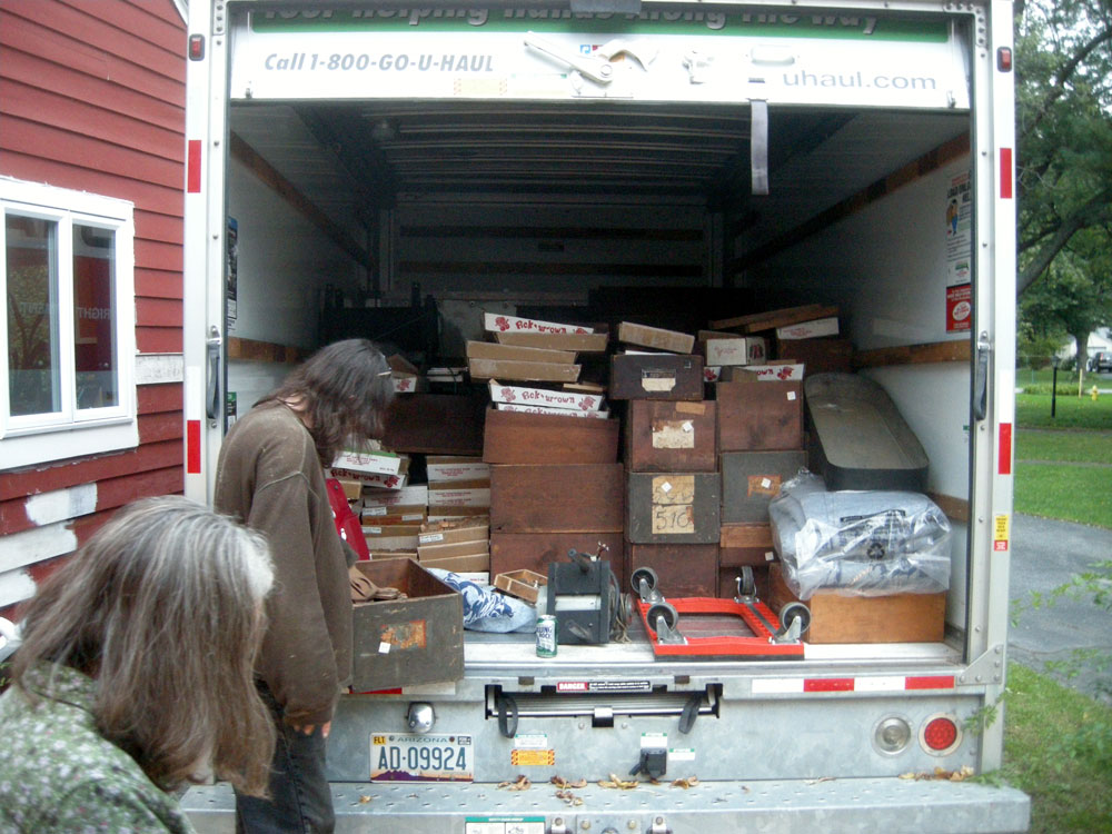 We helped Bill and Geri unload the type making machine that is hidden behind the boxes of patterns and type in the photo above. Nine of us gathered on Sunday afternoon as Bill pulled off a marvelous, madcap, engineering performance that ensured a graceful decent for the 800 pound, steel machine.