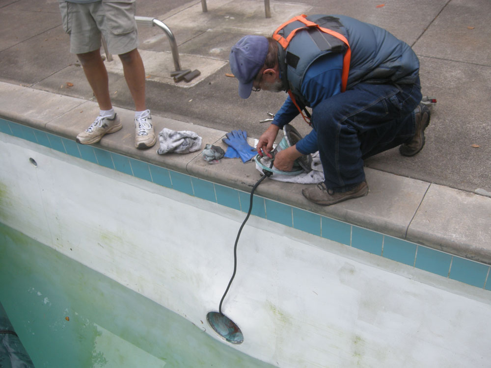 Electricity and water make strange bedfellows. Our neighbors were taking a midnight dip in the street pool and the underwater light went out. None of the current members remember ever having to replace it so we collectively stumbled through the whole process. There was an engineer involved so I could never catalog all of the methodical steps.