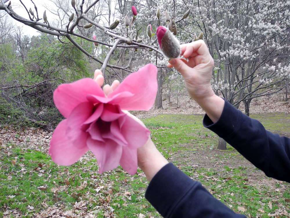 The temperature barely got in to the fifties today but it felt warm in the woods. Last year Spring came on like gangbusters so everything was in bloom at once and it was over before we knew it. This year it’s taking its time and that’s ok with me. We cut through the park to check on the magnolias. The pink ones are dropping, deep red ones are just starting to open and the yellow ones are still tucked in their fuzzy cocoons. The colors look more dramatic on cloudy days so quit yer complainin’.