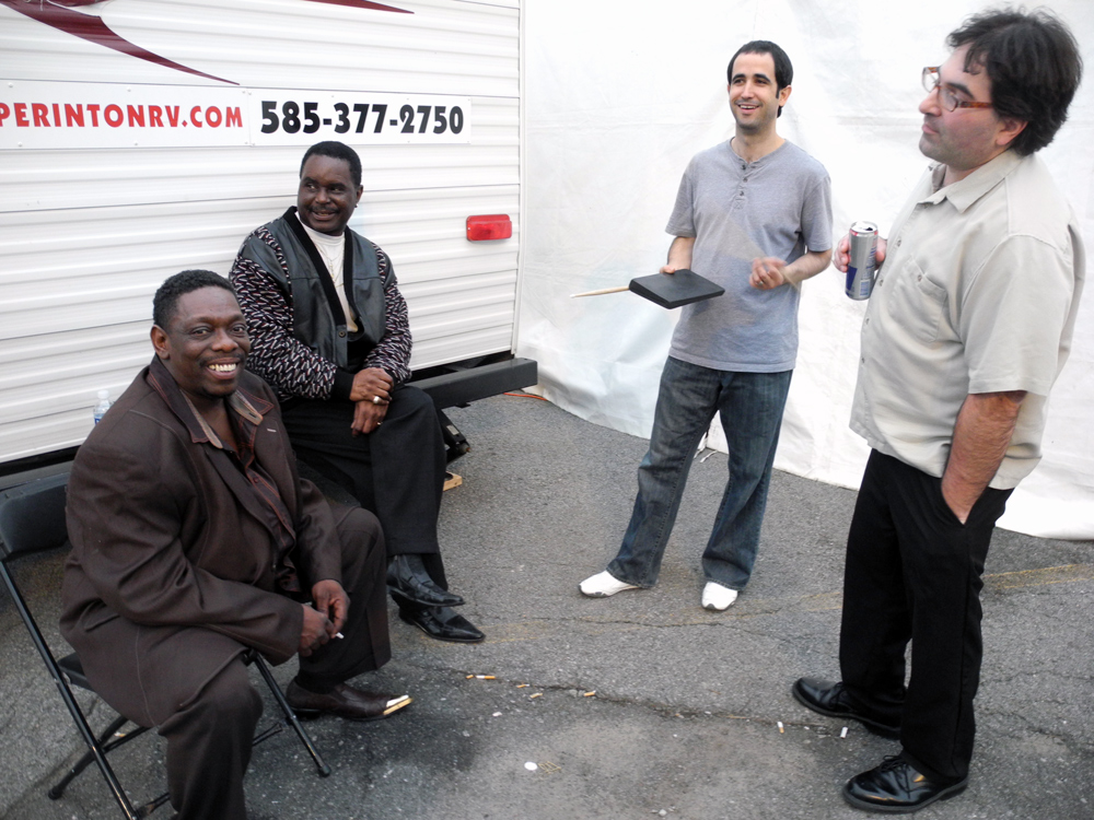 There’s one extra in this picture, the guy sitting behind Lucky Peterson. His Cuban born drummer and New Orleans’ bass player are to his right. Lucky grew up in Buffalo. You can tell by looking at his boots. He played with Little Milton and Bobby Blue Bland so his blues has soul. He is a monster on the organ, piano and guitar. He has a voice big enough to comand attention in a full house (in this case a tent) while off mic. He has the showmanship thing down with spades!