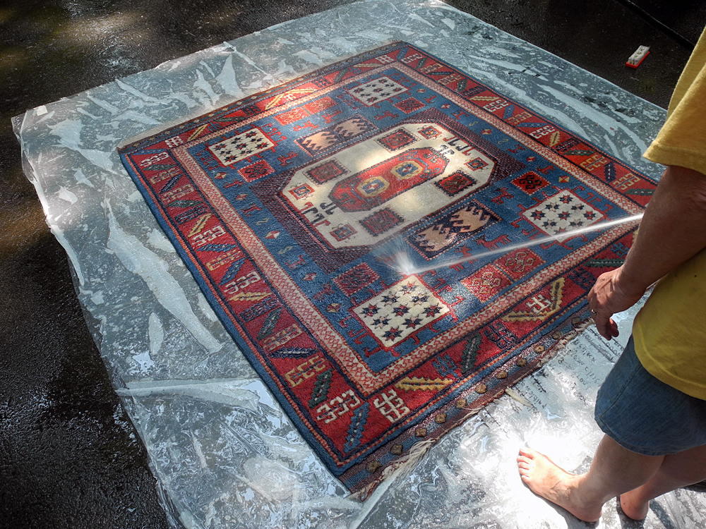 We bought this rug many years ago at Jacobsen’s on Salina Street in downtown Syracuse. We have a few Oriental rugs in our house and they all need washing. It’s our own fault. We don’t take our shoes off when we come in from outdoors, only when we’ve been hiking. We used to call Asian people “Orientals” and I’m glad we swapped that word out. We need a better one for these rugs. I think this one came from the former Soviet Union and “Oriental” just doesn’t seem right.