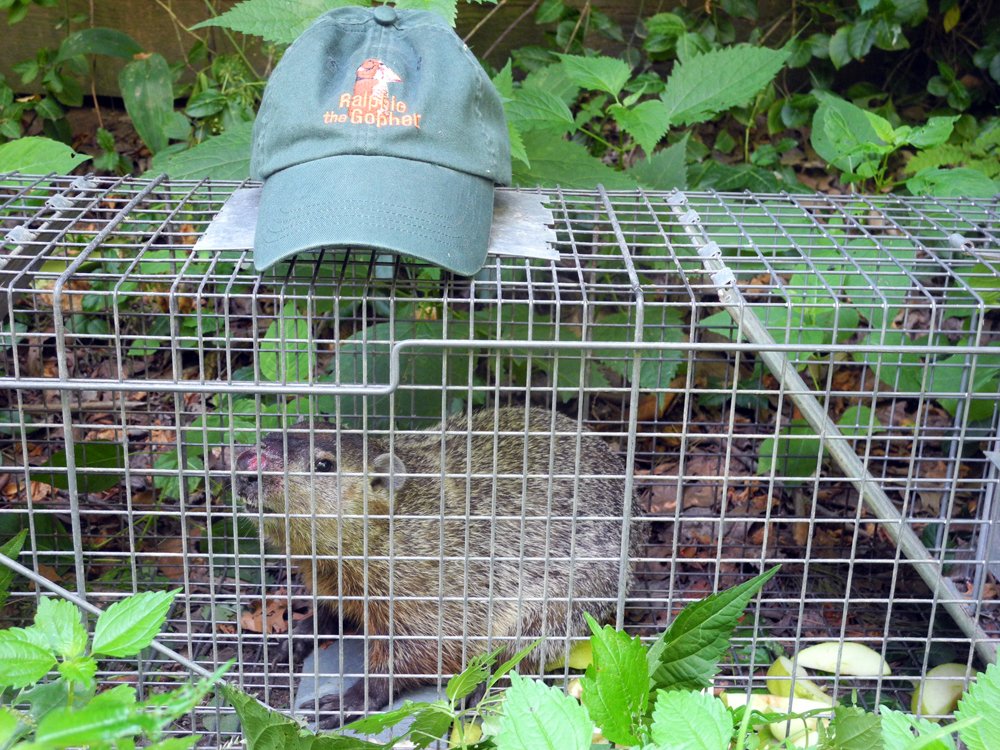 This morning we checked email before heading out for a walk and our neighbor sent one telling us he had captured the varmint. We stopped down there and found Ralphie, just as we pictured him, in a cage with a few slices of apples. It looked like he had worn a hole in his nose trying to get out this trap. It will will be a long hot weekend for hi him before the town picks him up on Tuesday and transports him over by the bay.