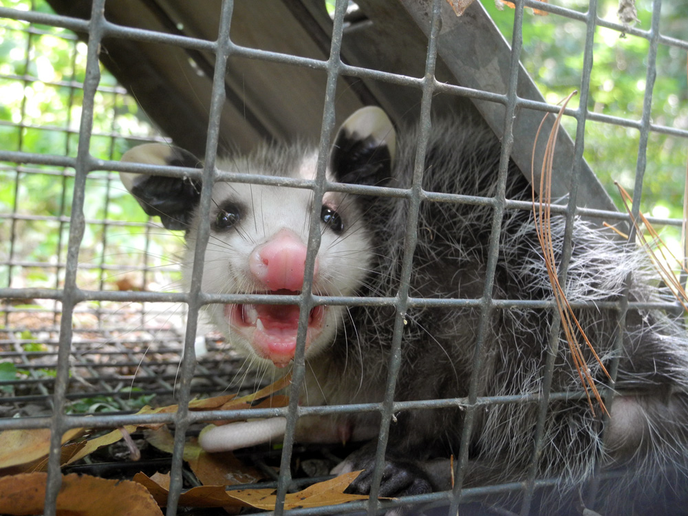 I went back down and told my neighbor that our trap was occupied and I thought it might be a skunk. He couldn’t wait to see for himself and interrupted his Rubino’s sub to come up and have a look. A former farm boy, he walked right up to the cage and said, “You caught a baby possum.”