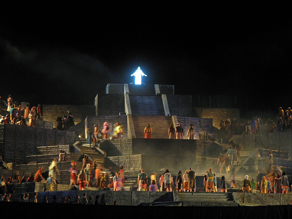 It is impossible to shut out the protests so they became a part of the show. The open field parking lot is wired for sound with speakers mounted high on poles playing the Mormon Tabernacle Choir or what sounds like loud funeral home music, all in an attempt to drown out the protests. It is a surreal experience just walking to the pageant grounds. The cast members, in full meso-american biblical costume, greet you with disarming smiles. I felt like I must have something permanently wrong with my face.