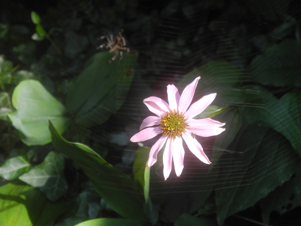 This spider web was glistening in the sunlight. That’s what caught my attention and when looked down I saw the spider who was responsible for the web hanging out near the center of his creation. He had another bug caught in the web and while I tried to frame a shot of them and the flower that was behind the web the spider pounced on the bug. There was a tussle, the spider got a few bites in and the bug fell off the web. I was having a hard time getting my camera to focus on the spider, the autofocus kept zooming in on the flower so I don’t have the drama in his shot.