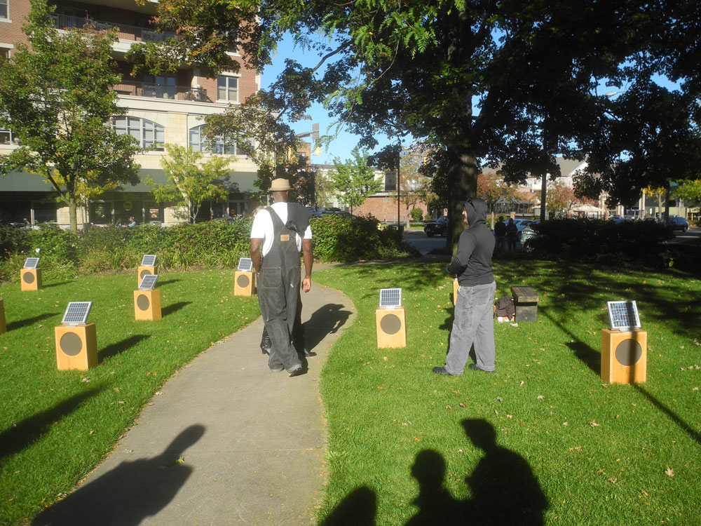 If you only do one event at the Fringe Festival I would suggest this one. It’s free and is happening on the lawn in front of the church next to Rochester Contemporary for one more day – tomorrow. The artist, Craig Colorusso, on the right above, had to move his solar powered speakers around as the sun got lower in the sky because without the sun they would not be able to play the loops of guitar notes that he has assigned to each speaker, all notes found in a Bb chord but the music they produce is so much more. We were mesmerized.
