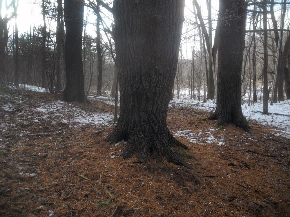 Our friends, Maureen and Karl are getting married at the Justice of the Peace today and there is a reception for them at their house this afternoon so I’m afraid we won’t have time to walk. In lieu of that I looked for a recent photo of the woods and found this one. I love how the trunk of the central tree appears to get wider as you move your eyes up. And the root structure, visible at the base, looks especially animated as the tree bursts out of the pine needles. I wish I was there now.