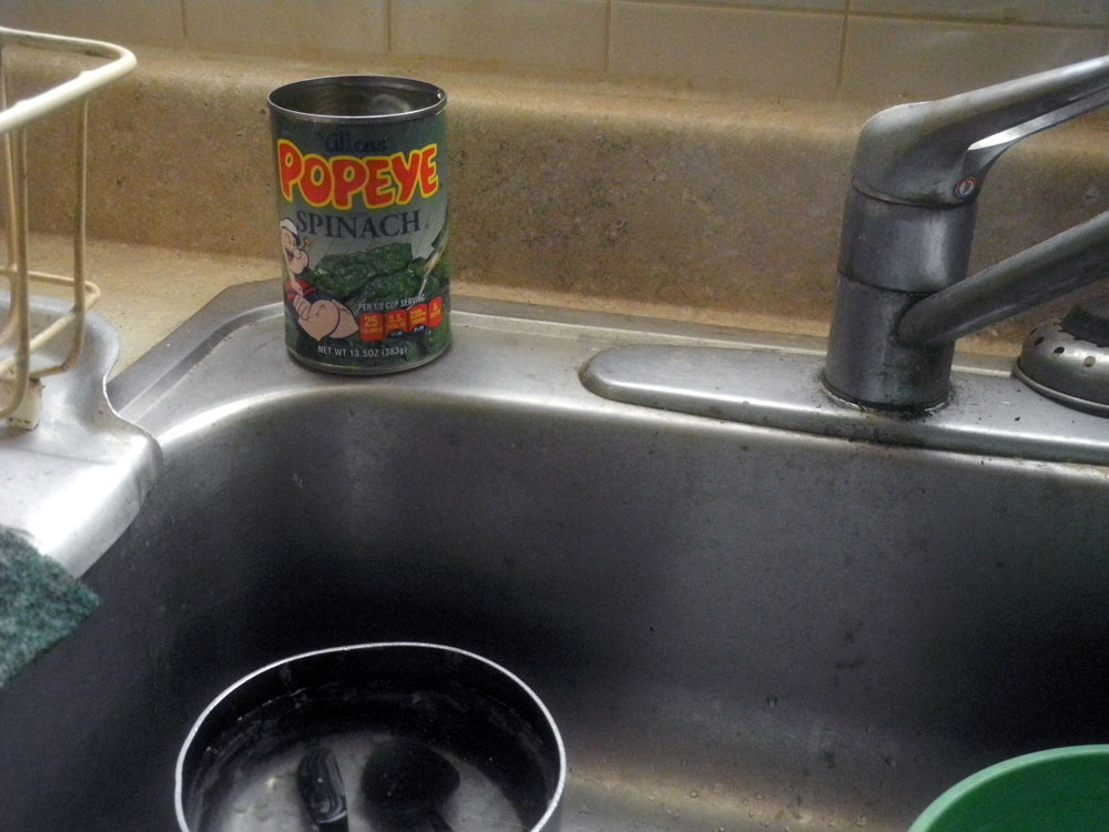I stopped over to visit Sparky, our former neighbor, and he had just finished lunch when I walked in. A dirty pot was still in the sink and empty can of Popeye spinach was on the edge of the sink. I felt as if I had finally discovered his secret potion and asked if I could take a photo of the can.