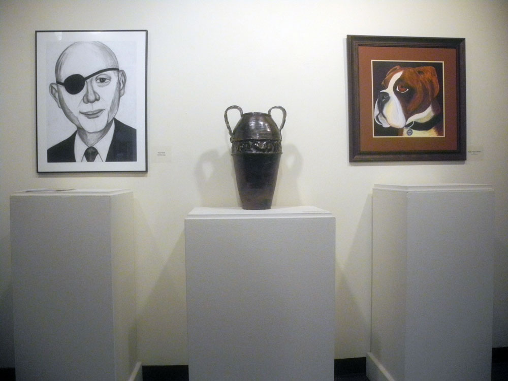 I love the play between these three items in the show, my “Investment Banker” with the one eyed dog (Pauline Johnson Brown’s “Buster”) and Violet Paolucci’s “Untitled” ceramic vase establishing real form in the center. The color dialog is quite nice as well. And then around the corner we found a watercolor of the dedication of the O”Rourke bridge by Leo Dodd and Peggi Fournier’s watercolor of an African boy.