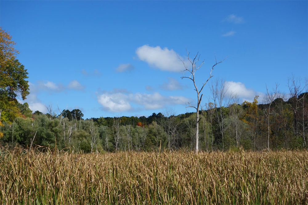 The bald, parched colors of the wood contrast with the changing colors of the surrounding trees. Surely the tree drowned and yet its very predicament, this setting in a marsh is what makes it so beautiful. Of course the form of the tree, seductively designed to outwit gravity until the last minute, is its finest feature.