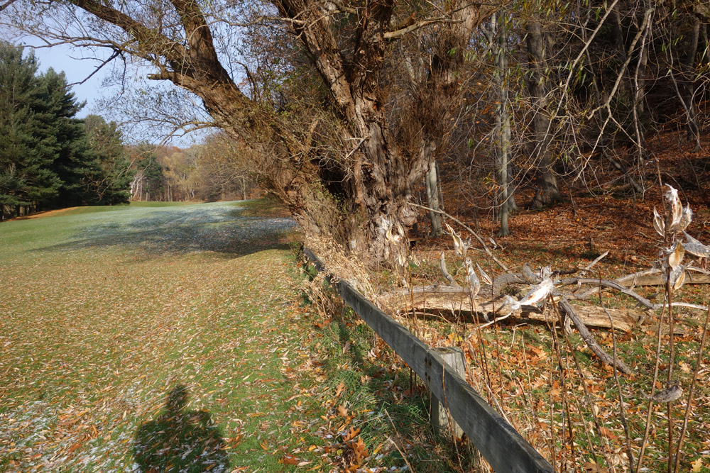 I took the photo above a few minutes ago. We usually take the path that runs into the woods behind the willow tree but the sun felt especially good today so we stayed on the fairway. There wasn’t a soul out, just the way we like it.
