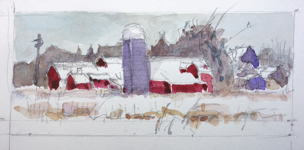 My father has a miniature watercolor station next to his chair in the living room of his apartment, the tiny “travel” paint set, a couple of brushes, some water and a small black notebook where he has been painting barns and cityscapes. These small paintings (the one above is shown almost actual size) are looser and more sketch-like than the large watercolors he does in his studio in the next room. He used the one above for his Holiday card and called it “Evening Exercise Sketch.” The back of his card had one of my favorite quotes. “Music is your own experience, your thoughts, your wisdom. If you don’t live it, it won’t come out your horn.” – Charlie Parker