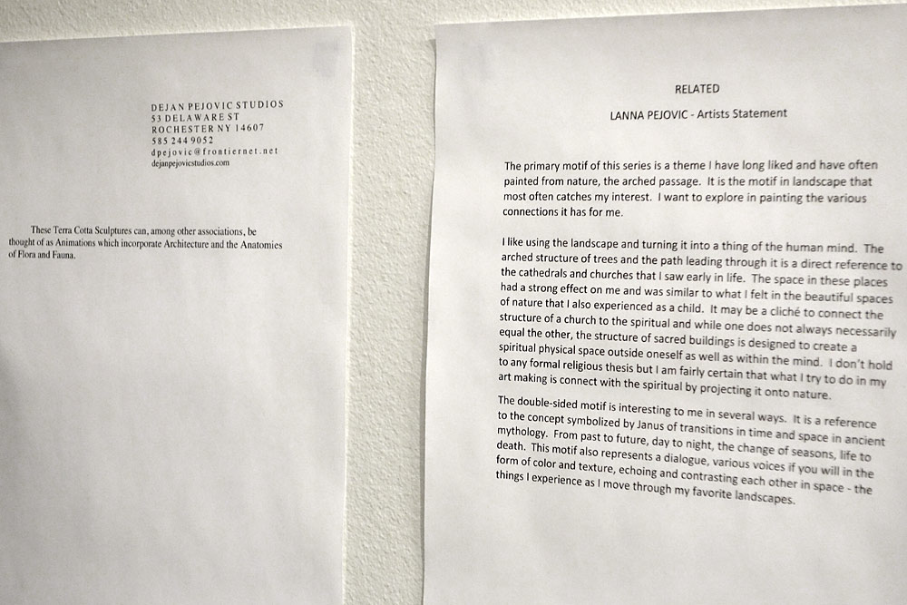 Dejan and Lanna Pejovic’s current art show at the Geisel Gallery in the old Bausch + Lomb headquarters is aptly entitled, “Related.” They are brother and sister and they say it is only a coincidence but Dejan’s terra cotta sculptures and Lanna’s arched-motif paintings are physically related as well. Dejan teaches a class across the hall from Fred Lipp’s class at the Creative Workshop and Lanna teaches drawing and painting at RIT.