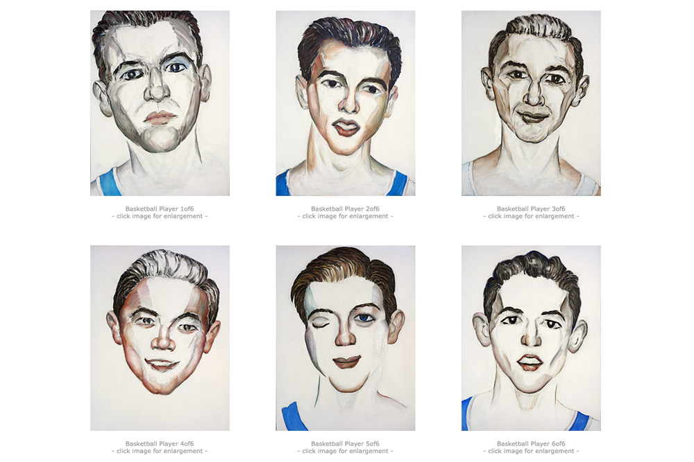 He told me he saw the article in the paper, the one where I said I painted these guys from a 1957 high school yearbook I found because the team looked so hapless. He said he was only a sophomore when that picture was taken. Two of the six are dead, the guys in the middle of both rows. One went on to work for the Green Bay Packers and this guy said he was the quarterback for the UofR. And the guy with one eye closed was not winking, he wasn’t injured on the court with an elbow or anything. His eye just didn’t work.