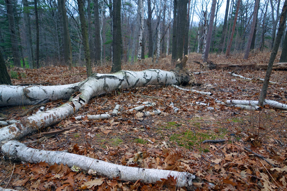 Hadn’t had a chance to walk in a few days so yesterday’s jaunt through the woods felt like recess back in Holy Trinity. Our most travelled route even felt brand new, especially so when we discovered Peggi’s favorite white birch had fallen.