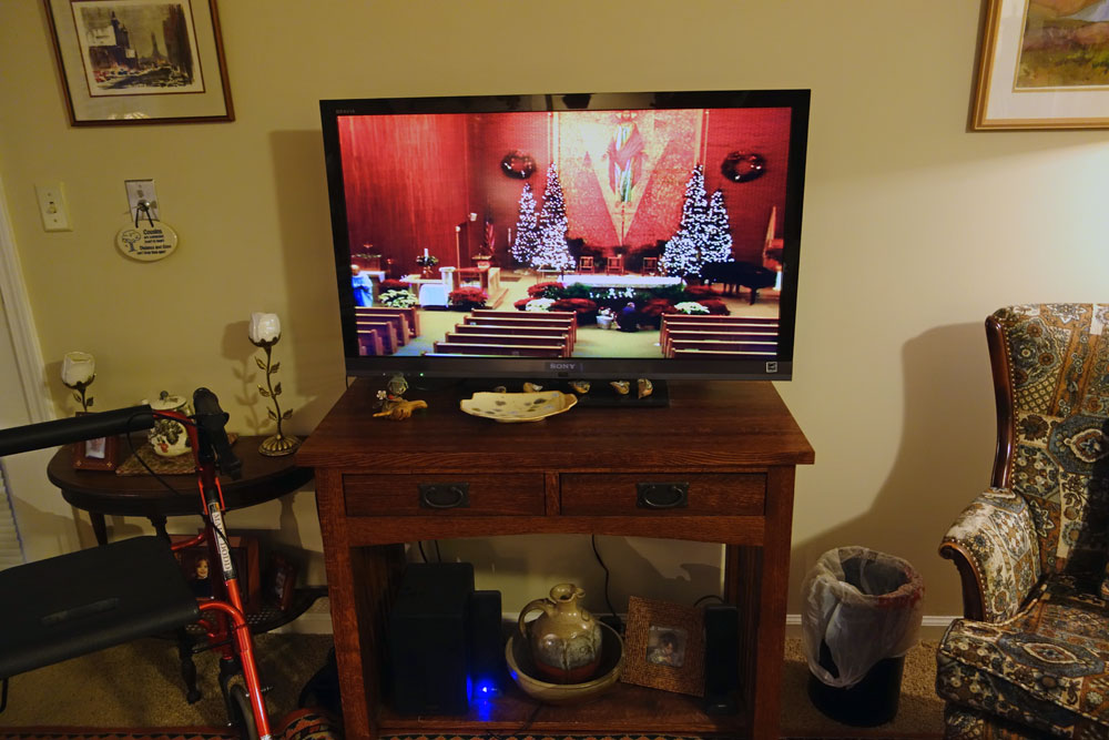 My mom flicks between American Movie Classics, Turner Classic Movies and the Hallmark station but none of them was doing it for her so we watched the Saturday evening mass that was being broadcast from the chapel in the high rise next door. I guess the broadcast counts as a mass of obligation these days. The pews were filled but only a janitor remained, picking up the flower petals, when I took this shot.