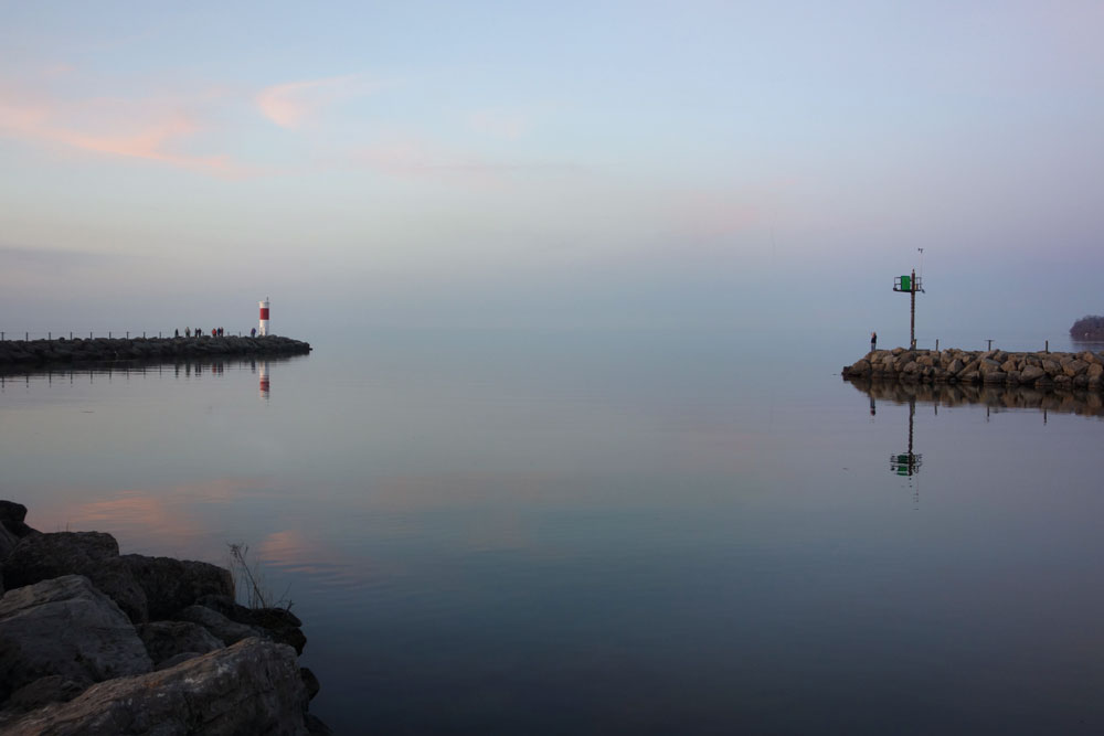 Calm Lake Ontario outlet between the two piers at Sea Breeze in Rochester, New York