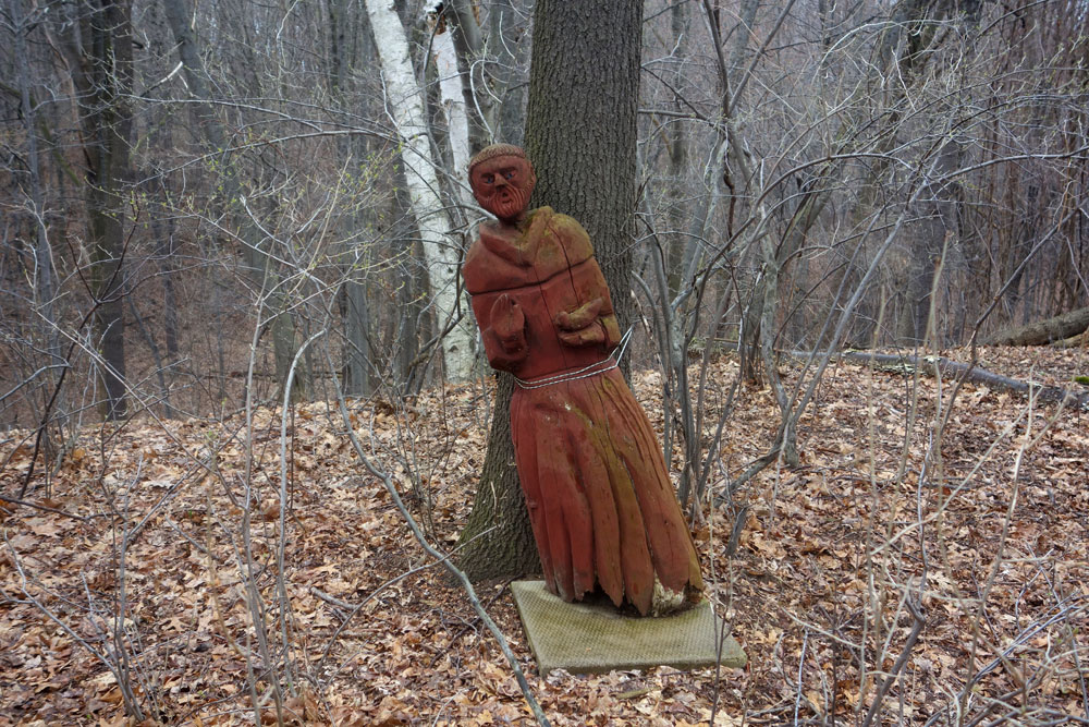 There is an old horse path that runs through the undeveloped part of Durand Eastman Park. It’s a beautiful trail that hardly gets any use although it did get a lot of attention when Bulldozer Man drove part of the trail with his earthmoving moving equipment about five or six years ago. Not a park employee or anything, just a private citizen, he atempted to clear the trial again for horseback riding. Some alert woods-walkers notified Larry Staub, the director of the Monroe County Park system. At one point this path skirts a cluster of homes and this statue stands behind a house at the edge of the woods. The base rotted out and he was laying down for a while. I probably have a picture of that on this blog somewhere. I keep track of that sort of thing.