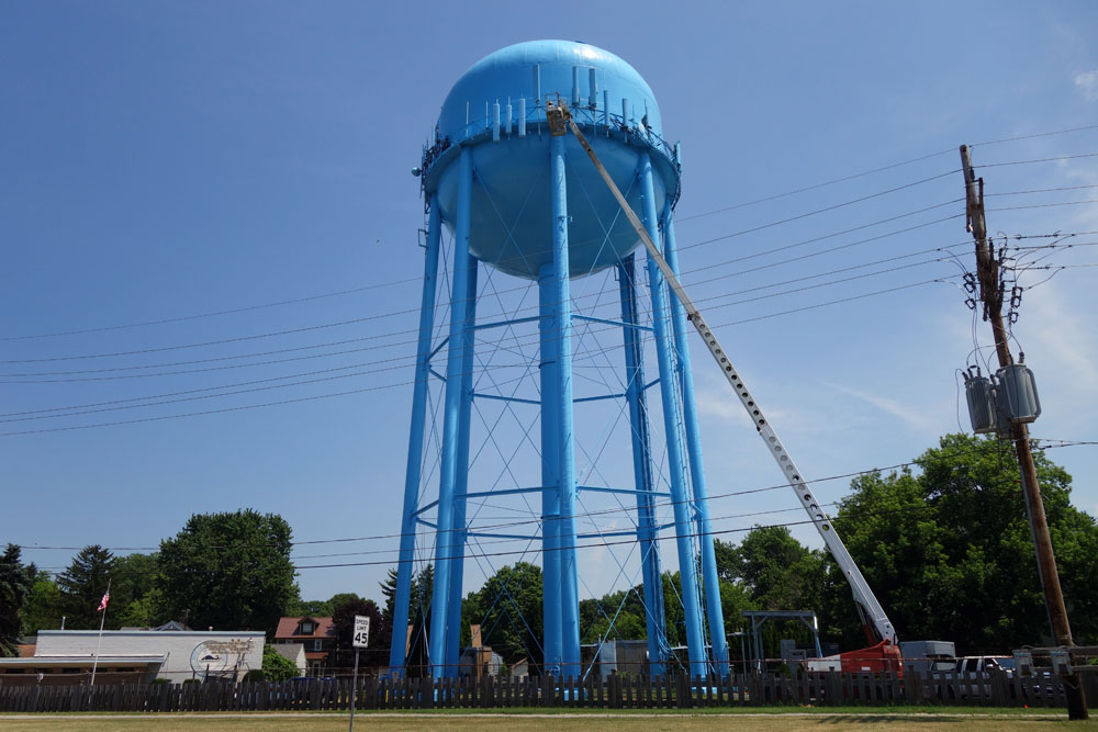 When we were young my mom would put us all in the car on days like this and drive us from our home in the city out to the lake. We would go one of two ways, out Culver Road to Durand Eastman Beach or out Lake Avenue to Charlotte Beach. Both routes had markers along the way, things we would look for and then shout about when we saw them. The trip down Lake Avenue was longer so when we spotted the flag flying above the CSX railroad crossing in Charlotte it was really dramatic. The water tower in Sea Breeze would come a little quicker when the destination was Durand. Peggi and I rode our bikes up to Wegmans yesterday and we spotted these guys installing a new cellphone receptor. I’m guessing the town makes more money leasing the space on the water tower to cell phone companies than they do from the sale of water to its residents.