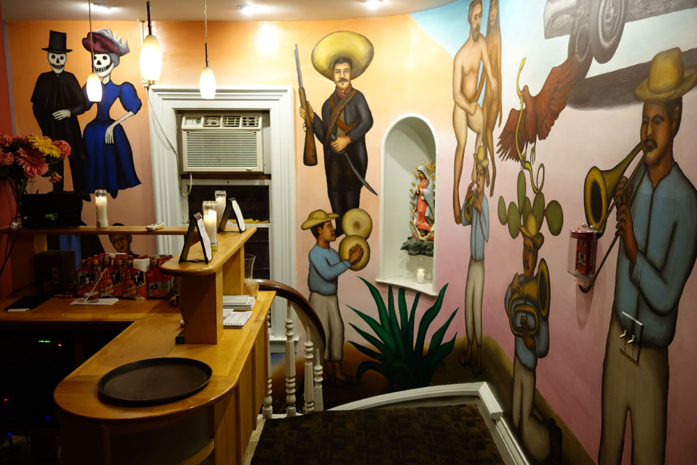 Casey asked me to paint a mural on the winding staircase that led up to the restaurant and I worked on it for three or so weeks. I used acrylic paint with a little bit of retarder because the stuff dried so quickly and I mixed the colors right on the wall using two, one inch brushes. I still had whole sections to do when they were getting ready to open so I asked my father for some help. He painted the Marigolds that the Mexican woman is selling right by the door as you come in. They were part of the early East End resurgence and the area got so hot it was eventually Mex’s downfall. A group of us used to sit out on the patio Friday evenings and watch people parade by. Their last day of business will be November 1, the Day of the Dead. Peggi and I stopped in there over the weekend. We didn’t know a soul but we ordered a Margarita and wandered about the place one last time.