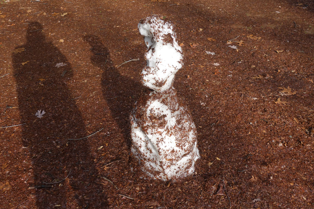 Our power went out this morning, a quick outage due to the wind. Peggi’s computer restarted on its own, mine needed to be rebooted. I was in the middle of editing songs for our new cd. Guitar tracks have been coming in fast and furiously, delivered by Dropbox. We took a walk after the blackout but stayed out of the woods because of the wind. There were some good sized branches in the street and the barricade on Zoo Road had been blown over. Peggi and I uprighted that. This snowman had a head that fell off a few days ago. It has completely melted body is in good form.