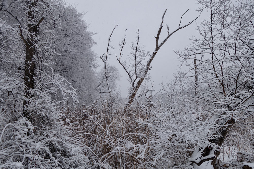 Wet snow and 40 degrees is not ideal for skiing but we had to get out there before it disappears. There was not enough for the woods so we drove to the golf course and strapped on our skis there. We left mostly green tracks in in our wake but managed to get up to the lake and back. The snowfall started as rain and then came down so wet it stuck to every branch.