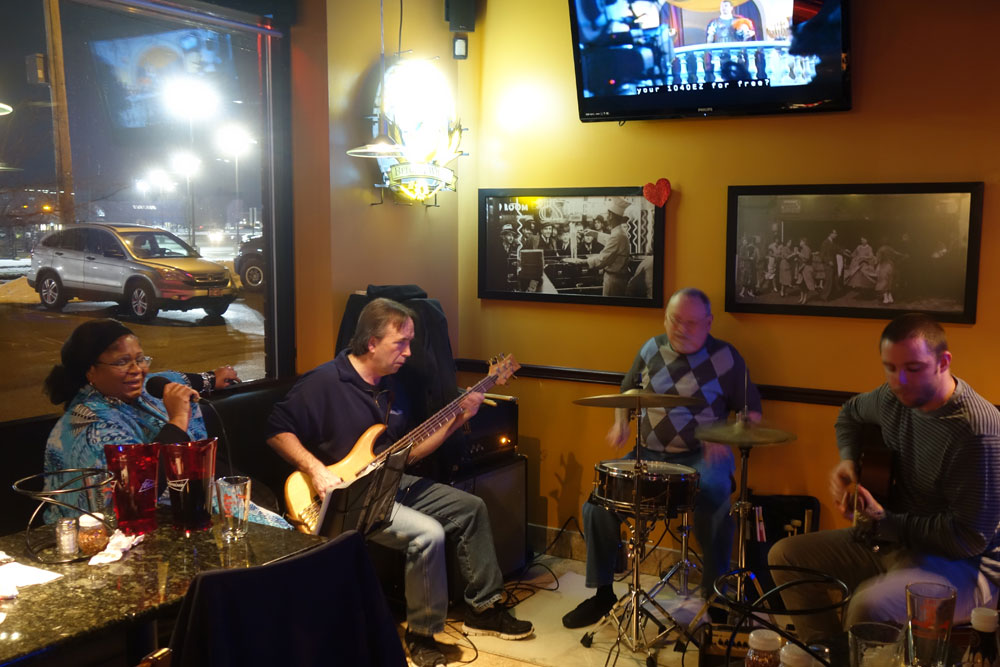 Webster has grown so much since I went to high school out there that I hardly know my way around. Pete Monacelli told us about a gig he had at Salvatore’s, of all places, and said it was on Empire Boulevard. I figured I’d be able to find it with the map on my iPad but there is no Salvatore’s on Empire. It is on Bay Road right across from Danny Flaherty’s place, the former Earthtone’s Coffee. A full bar and dining room surrounded by tvs with sports on, it is the most unlikely place for a swinging, sophisticated blues band.
