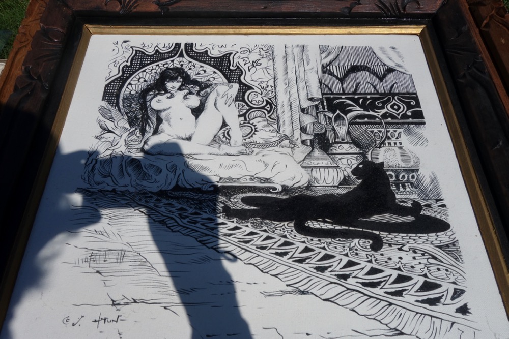 We were headed up to Wegman’s on our bikes. We needed just about everything so I had three bags in my basket. There were garage sales on every side street and we turned down one that had a sign pointing to a “Monster Garage Sale.” I was kind of intrigued by this graphic poster but we moved along without buying anything.