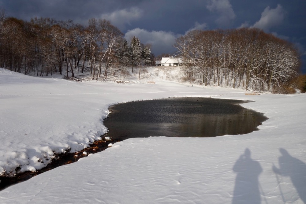 There is a volunteer cross country ski foundation that grooms the golf course at Durand each Winter. It’s $10 for four months and if you are a member you can check out the conditions before leaving the house. They had already groomed a few trails by the time we got down there this afternoon so we were able to ski up to the lake but the ground is not frozen yet so it got sticky. We are supposed to get another foot tonight so that will help.